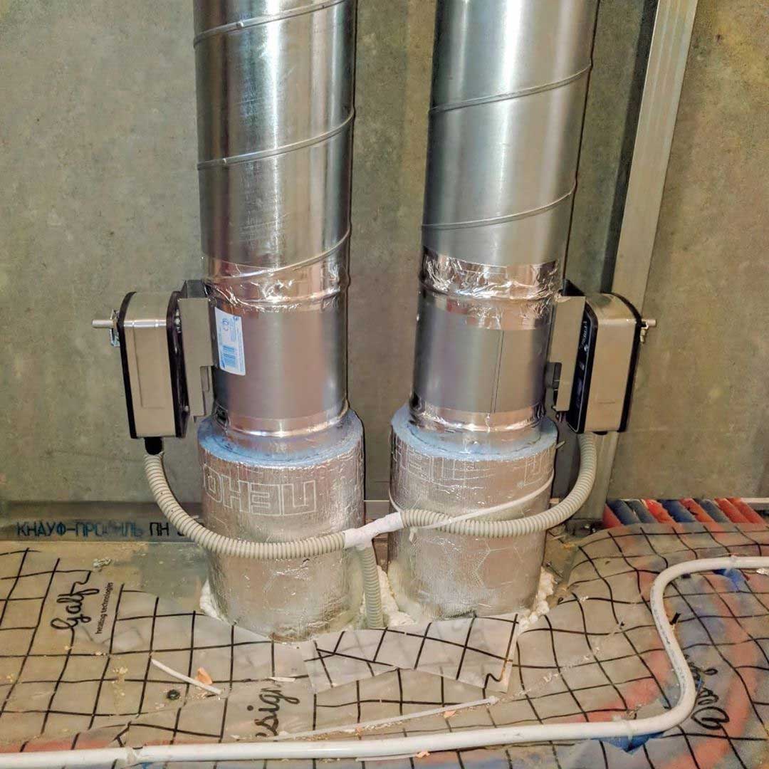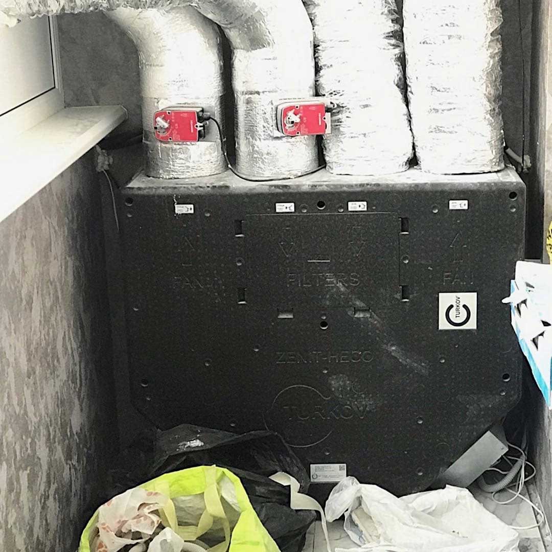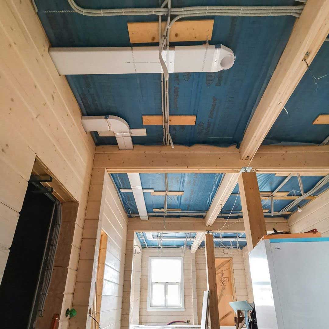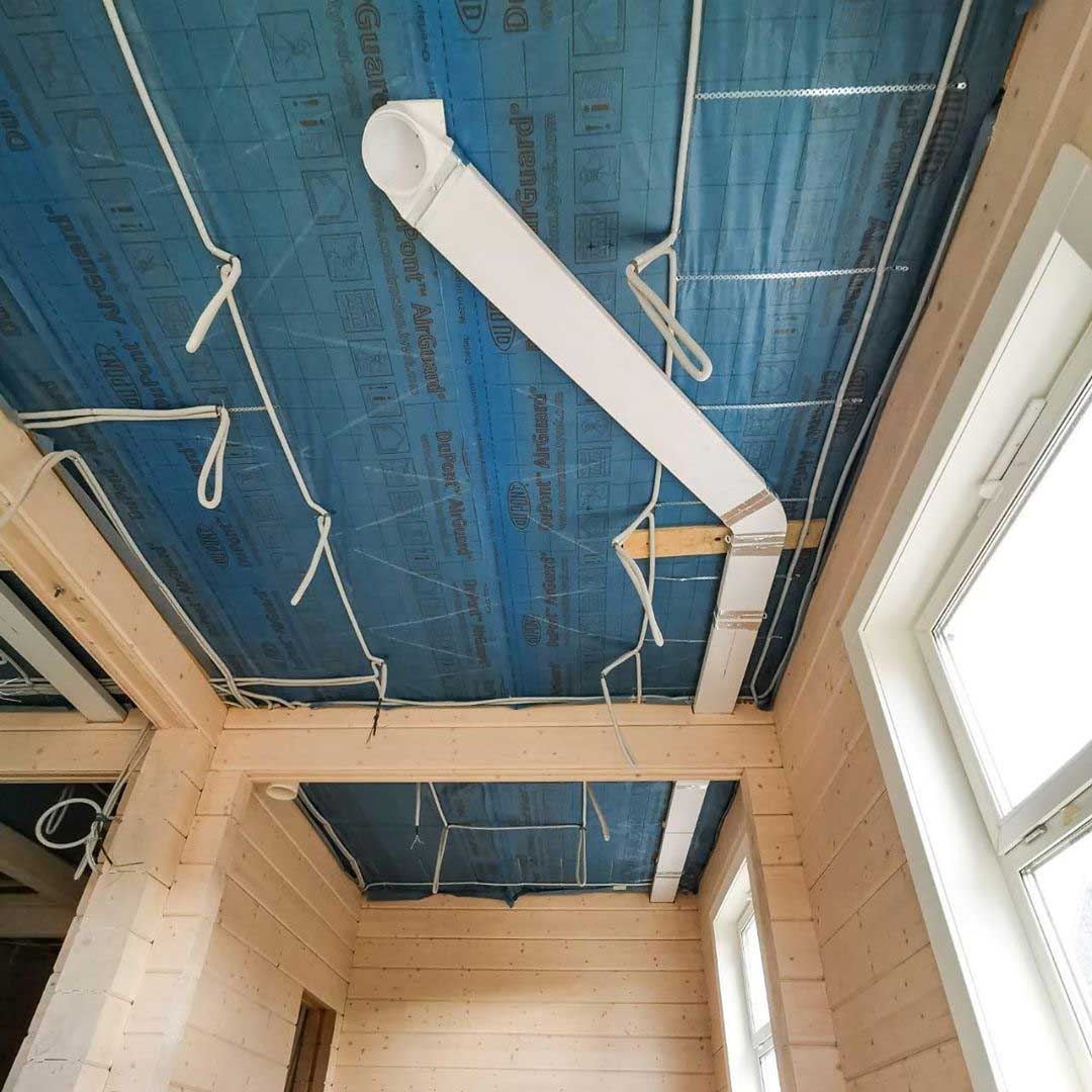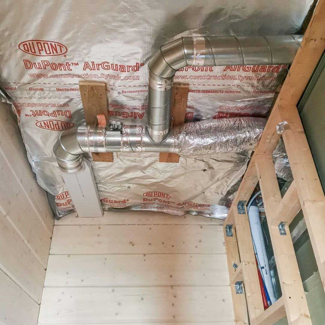 Система вентиляции организована на базе высоконапорной установки Zenit 550 Heco HE. Вентиляционная установка и разводка второго этажа смонтирована в неотапливаемом подкровельном пространстве. Для минимального опуска потолка разводка первого этажа выполнена пластиковыми воздуховодами под потолком, в несущих балках предусмотрены закладные. Схема разводки вентиляции выполнена по стандартам проектирования пассивных домов: приток в жилые помещения, вытяжка - из технических и мокрых зон.
