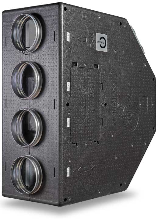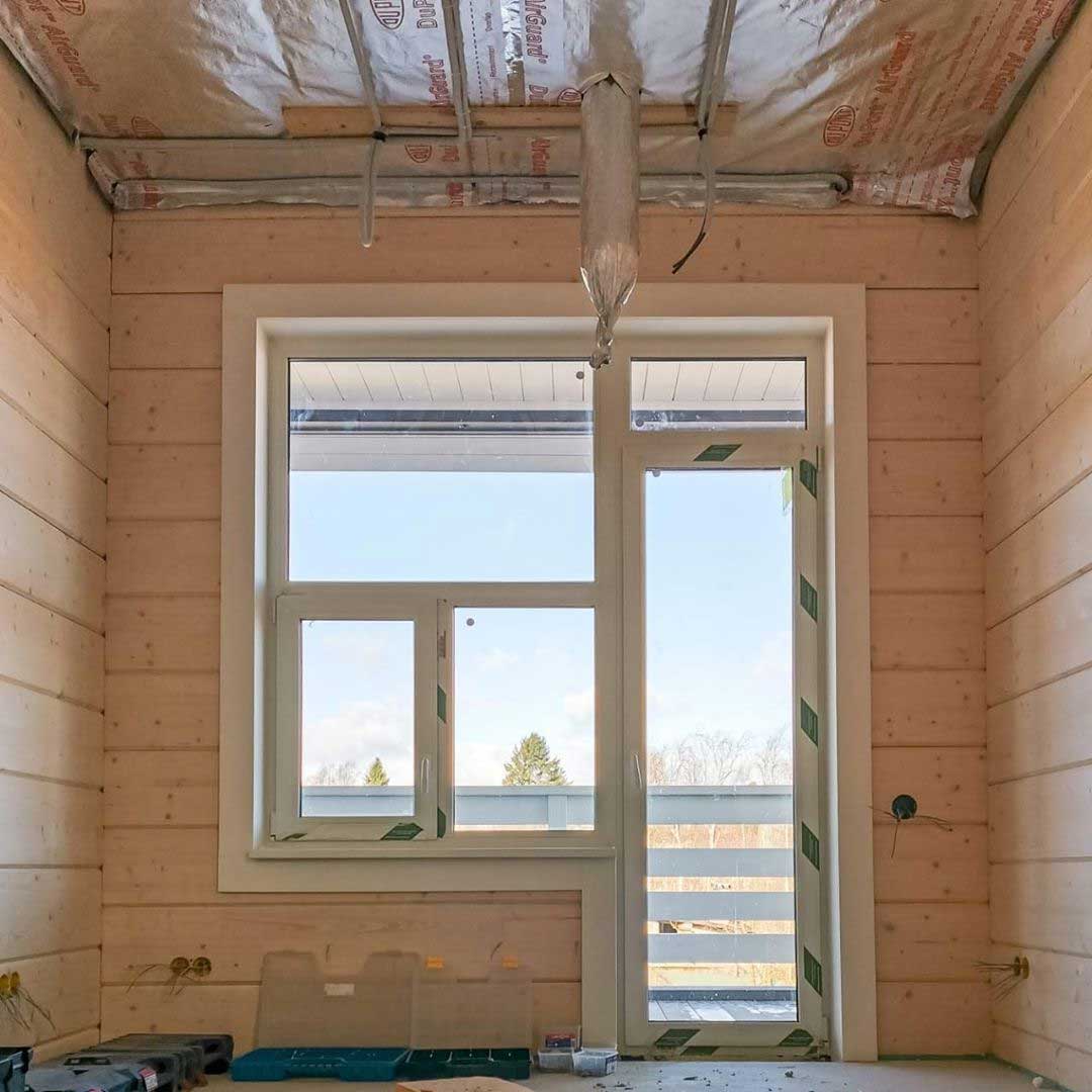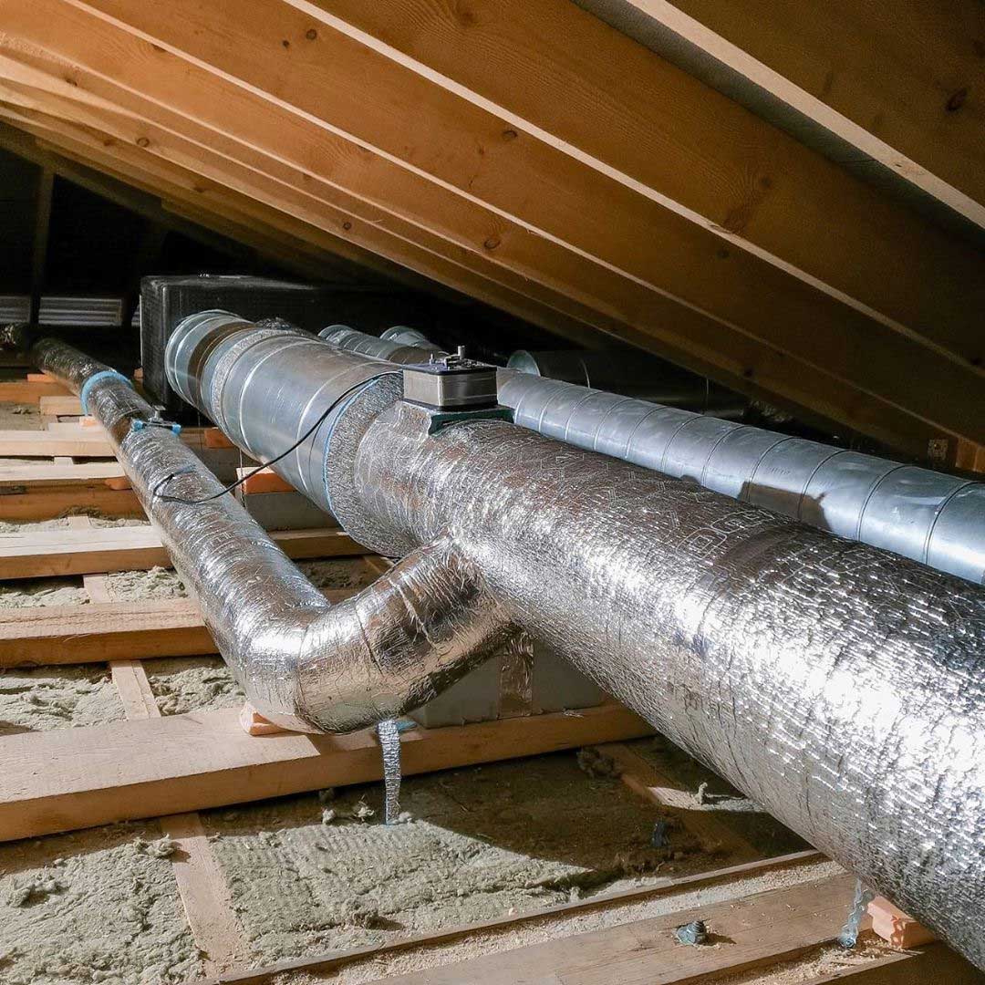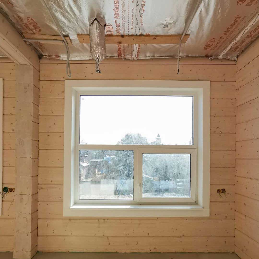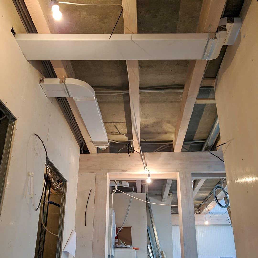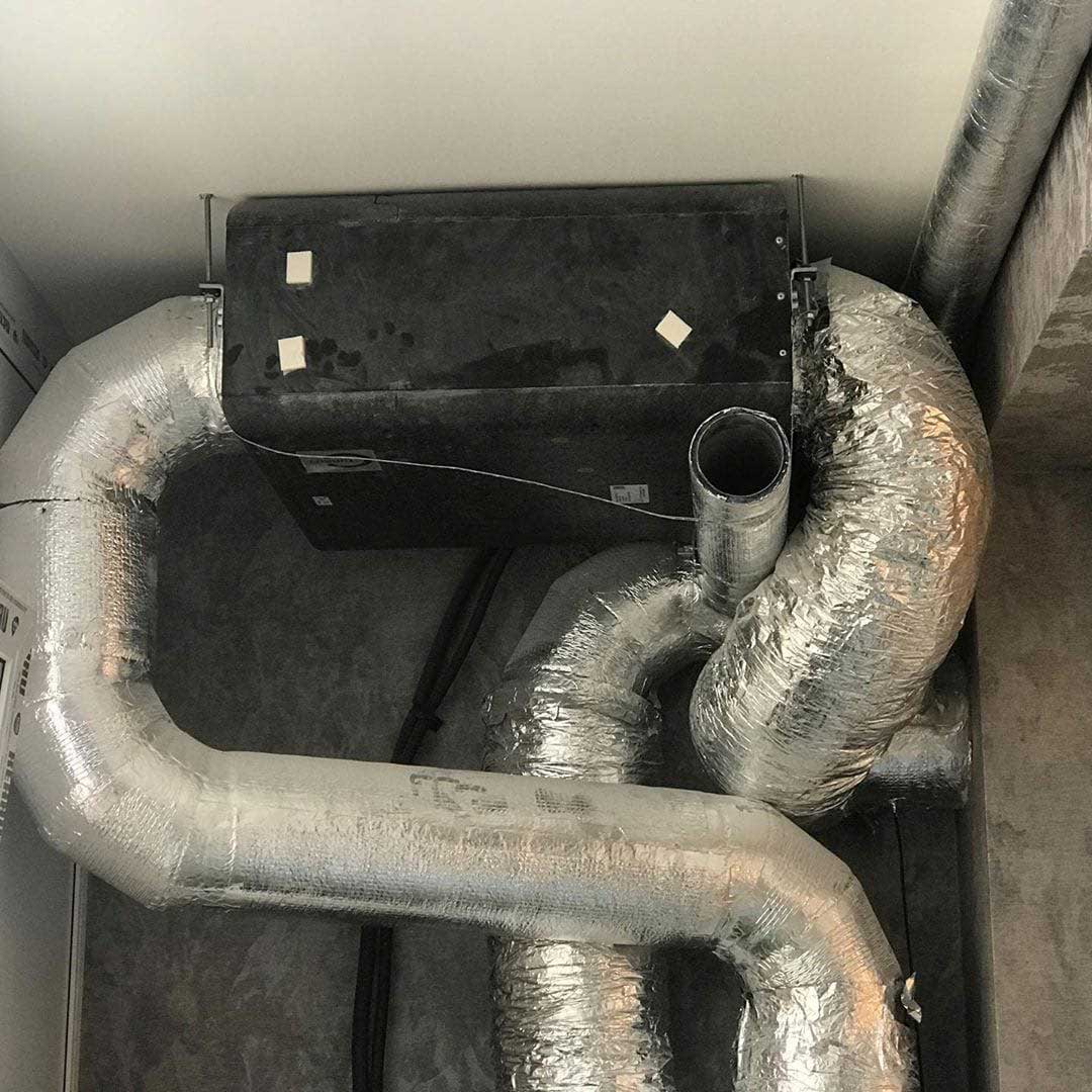 Система вентиляции организована на базе высоконапорной установки Zenit 550 Heco HE. Вентиляционная установка и разводка второго этажа смонтирована в неотапливаемом подкровельном пространстве. Для минимального опуска потолка разводка первого этажа выполнена пластиковыми воздуховодами под потолком, в несущих балках предусмотрены закладные. Схема разводки вентиляции выполнена по стандартам проектирования пассивных домов: приток в жилые помещения, вытяжка - из технических и мокрых зон.