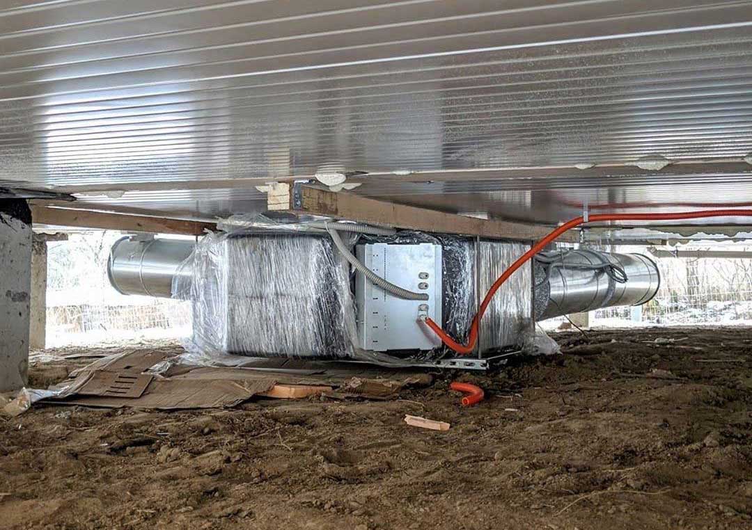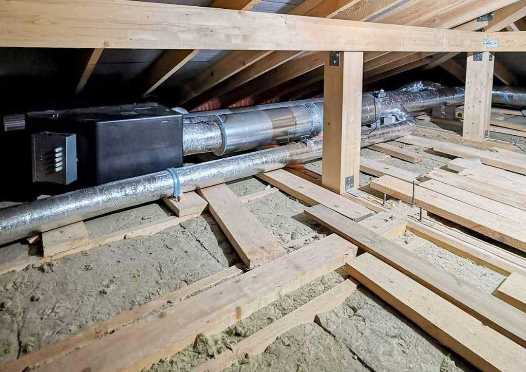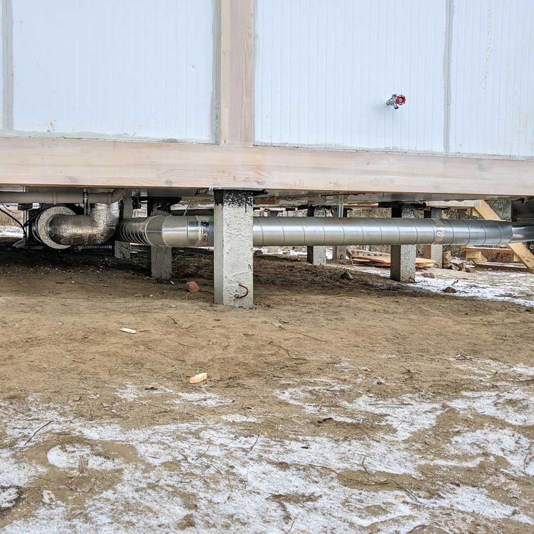 Особенности данного дома - несущие балки, которые являются частью интерьера, поэтому занижать потолки невозможно. Эту проблему решили, разместив воздуховоды в межбалочном пространстве. Чтобы не занимать котельную, оборудование было решено спрятать в свайном поле. В помещения входят только два воздуховода.