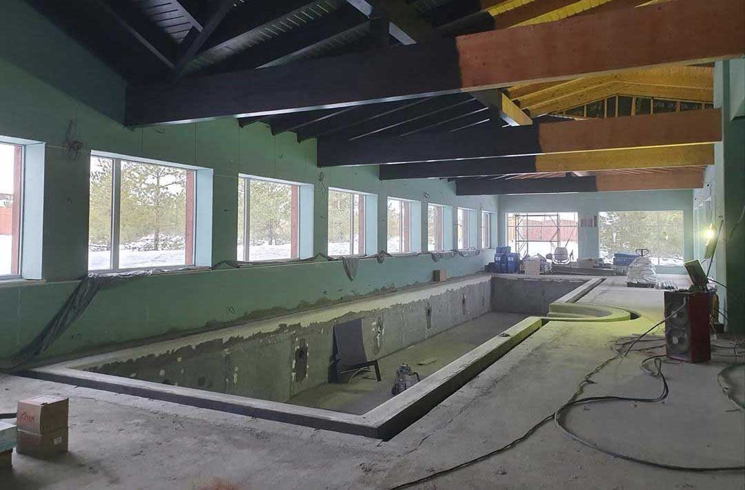 Окна по периметру бассейна занимают около 60-70% всего пространства. Приточный воздух подается вдоль окон снизу вверх, причем подается двумя путями: щелевыми решетками и конвекторами, которые работают с диаметральными вентиляторами без подмеса наружного воздуха. Объем помещения 1000 м³, вентиляционная установка рассчитана на 6000 м³, что образует шестикратный обмен объема воздуха. Данное решение применимо потому что бассейн отапливается только тепловым насосом и конвекторами.