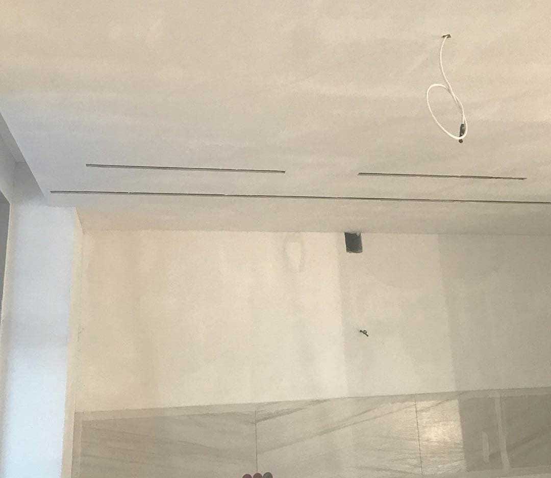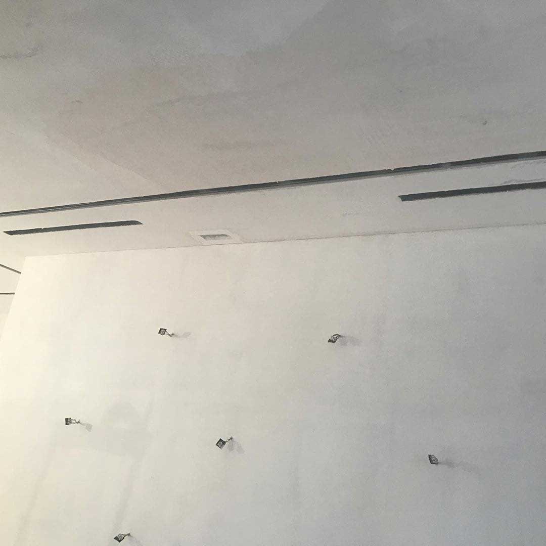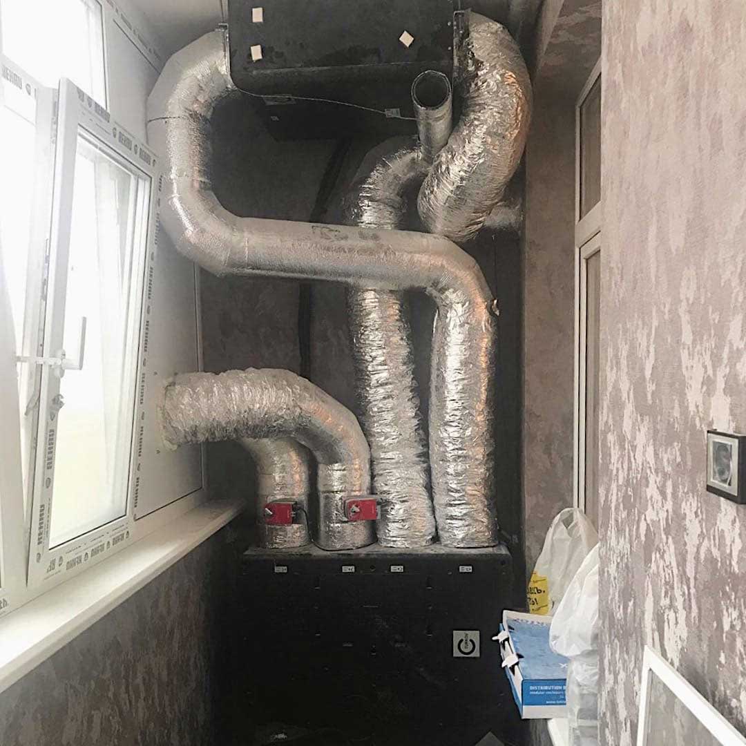 Закончили монтаж приточно-вытяжной вентиляционной системы с рекуперацией тепла и влаги. В дальнейшем вентиляционное оборудование закроют «фальшь» шкафом. В систему встроен канальный охладитель. Чтобы не разносить на 2м заборный и выбросной воздуховоды, применили комбинированную уличную решетку. В помещении осталось смонтировать щелевые решетки.
